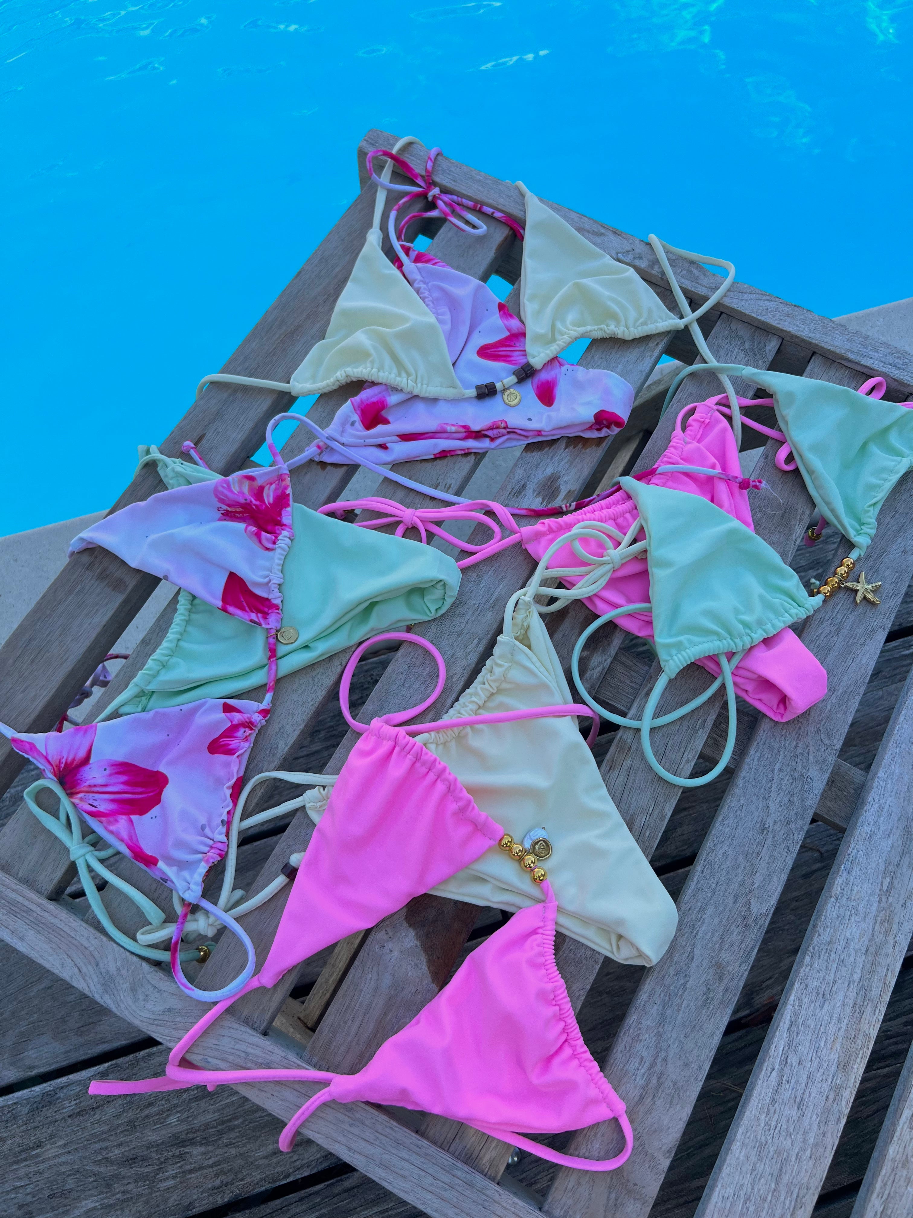 Tous les maillots de bain proposés par Mara Swimwear sont confectionnés à la main, avec une personnalisation décorative choisie par le client. Bien que certaines combinaisons puissent être similaires, chaque pièce est réalisée sur commande en fonction des préférences exprimées lors de l’achat.